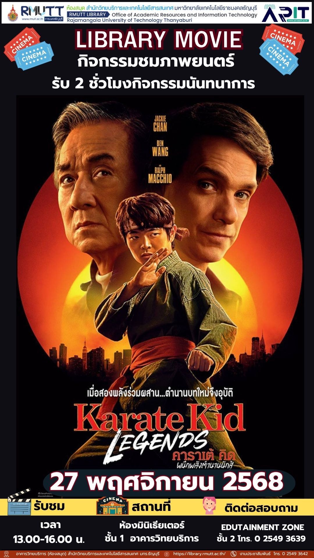 ห้องงสมุด มทร.ธัญบุรี ขอเชิญชวนนักศึกษาทุกคณะเข้าร่วมกิจกรรมชมภาพยนตร์ “คาราเต้ คิด ผนึกพลังตำนานนักสู้ (Karate Kid Legends)” ในวันพฤหัสบดีที่ 27 พฤศจิกายน 2568 เวลา 13.00 – 16.00 น. ณ ห้องมินิเธียเตอร์ ชั้น 1 อาคารวิทยบริการ พร้อมรับชั่วโมงกิจกรรมนันทนาการจำนวน 2 ชั่วโมง