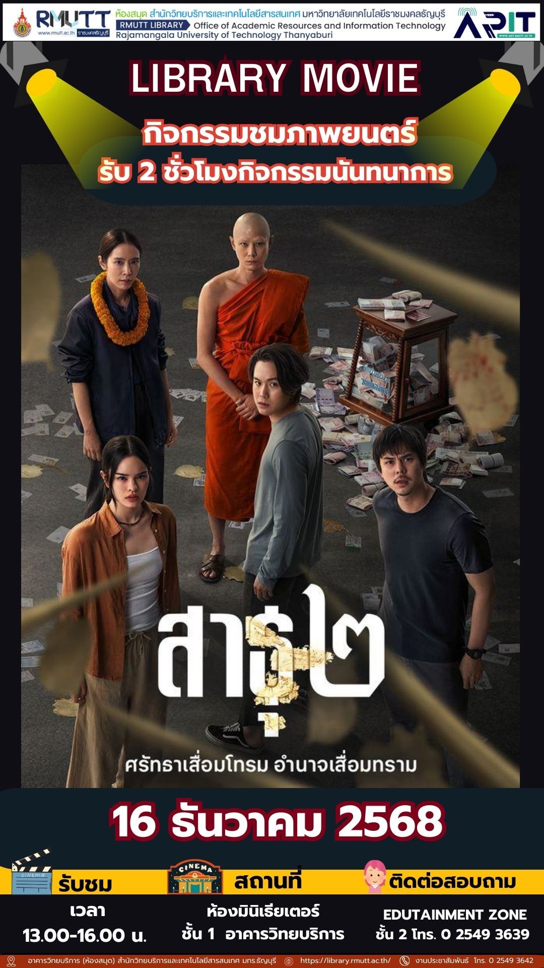 ห้องสมุด มหาวิทยาลัยเทคโนโลยีราชมงคลธัญบุรี ขอเชิญชวนนักศึกษาทุกคณะร่วมเปิดประสบการณ์ความบันเทิงและการเรียนรู้ผ่านภาพยนตร์เรื่อง “สาธุ” ในกิจกรรมชมภาพยนตร์ประจำเดือน