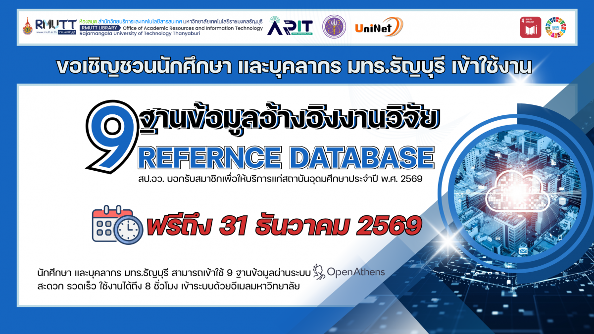 นักศึกษา อาจารย์และเจ้าหน้าที่ของ มทร.ธัญบุรี สามารถเข้าใช้งานทั้ง 9 ฐานข้อมูล เพียงครั้งเดียวผ่านระบบ OpenAthen ลิงก์>> https://my.openathens.net จากนั้นเข้าระบบด้วย e-mail ของมหาวิทยาลัยฯ ได้แก่ @rmutt.ac.th หรือ @mail.rmutt.ac.th หรือ @en.rmutt.ac.th ใช้งานได้ทั้งภายในและภายนอกมหาวิทยาลัยฯ ผ่านระบบ OpenAthens ได้นานถึง 8 ชั่วโมงของการใช้งาน สะดวก ง่าย ไม่ต้องติดตั้ง VPN