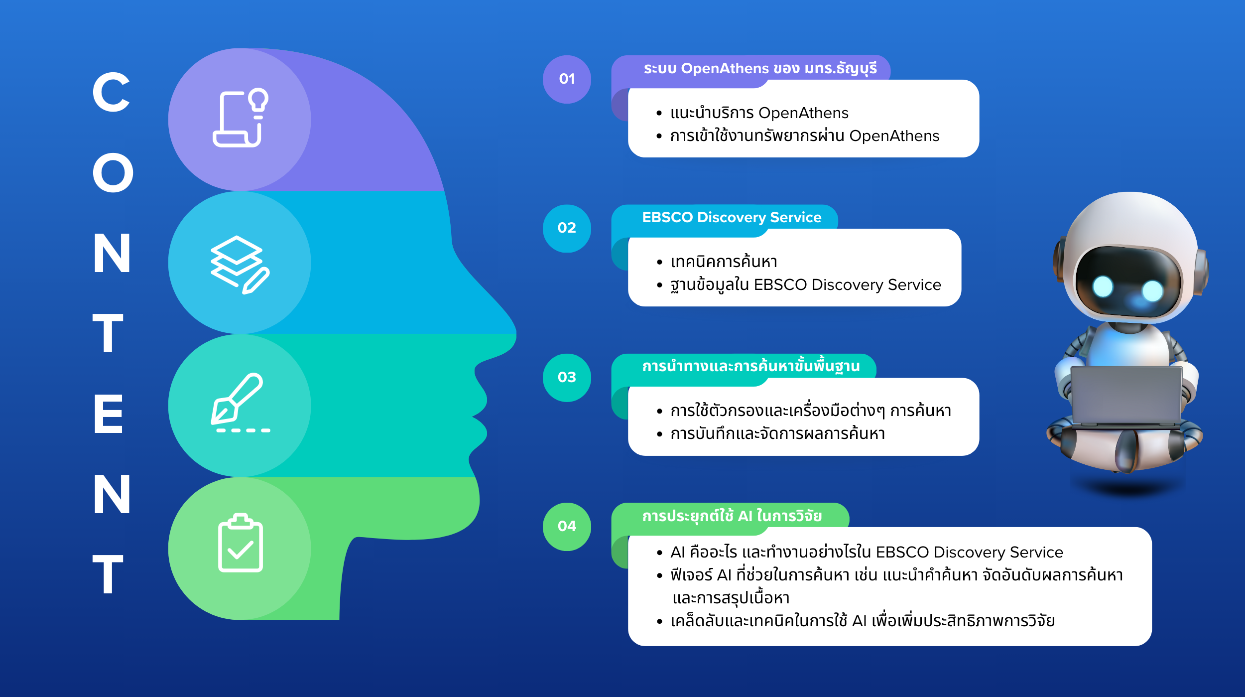 “พัฒนาทักษะการสืบค้นสารสนเทศด้วยระบบ OpenAthens และประยุกต์ใช้ AI ในฐานข้อมูล EBSCO Discovery Service”