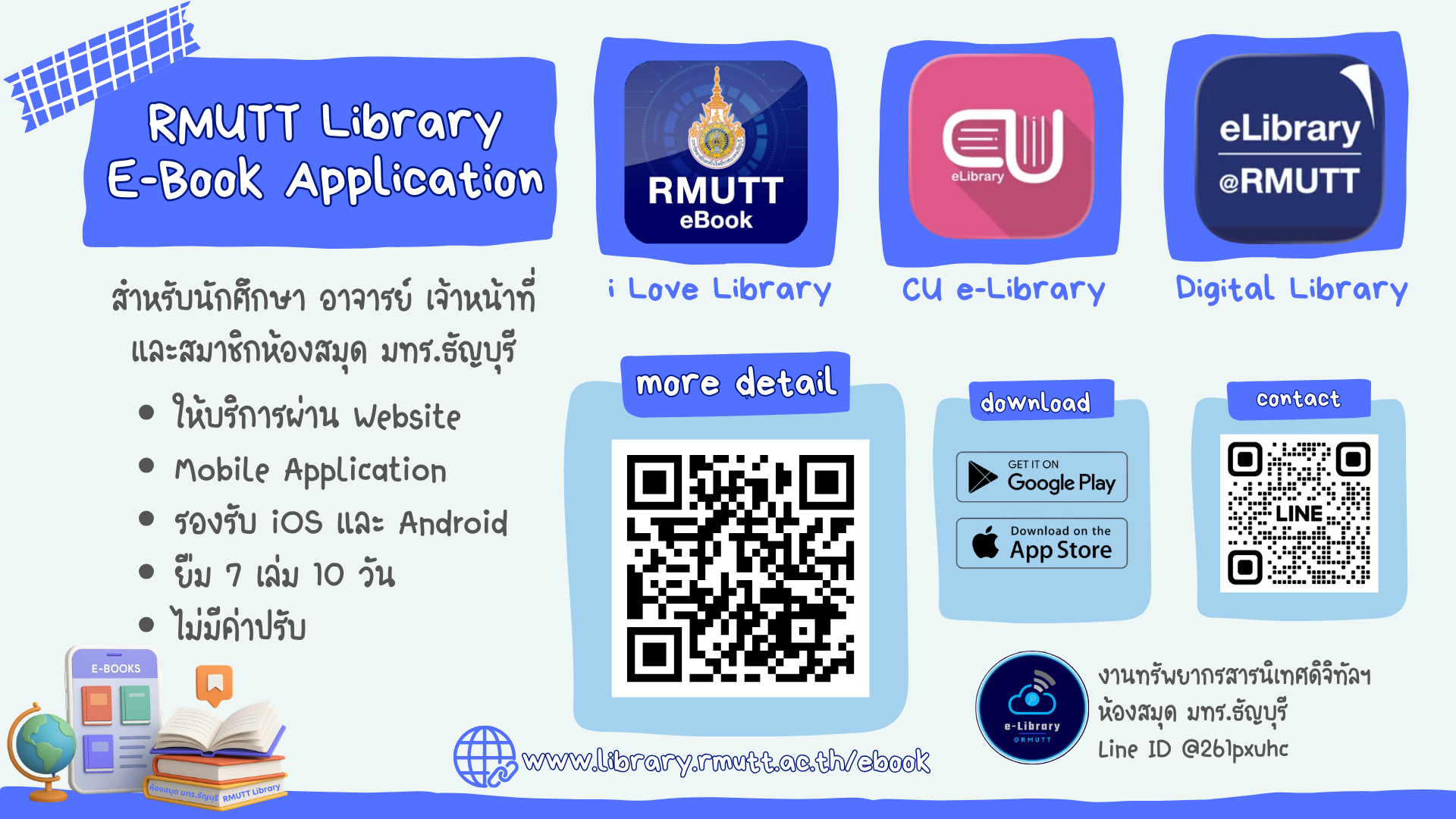 ห้องสมุด มหาวิทยาลัยเทคโนโลยีราชมงคลธัญบุรี พร้อมสนับสนุนการเรียนรู้ของนักศึกษา อาจารย์ บุคลากร และสมาชิกห้องสมุด ด้วยบริการ RMUTT Library E‑Book Application ที่ช่วยให้การอ่านหนังสือเป็นเรื่องง่าย สะดวก และเข้าถึงได้ทุกที่ ทุกเวลา ผ่านทั้งเว็บไซต์และแอปพลิเคชันบนสมาร์ตโฟน