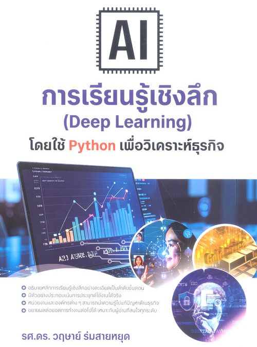 หนังสือ AI การเรียนรู้เชิงลึก (Deep Learning) โดยใช้ Python เพื่อวิเคราะห์ธุรกิจ เล่มนี้ ประกอบด้วย 2 ส่วนหลักคือ ภาคทฤษฎี ได้แก่ หลักการเรียนรู้เชิงลึก และกระบวนการและอัลกอริทึม การเรียนรู้เชิงลึก และภาคประยุกต์ ได้แก่ การนำเสนอโจทย์ปัญหาและตัวอย่างการพัฒนาแบบจำลองด้วยภาษาไพธอน การทำงานด้านต่างๆ ด้วยอัลกอริทึมการเรียนรู้เชิงลึก การจำแนกการแสดงออกทางอารมณ์ใบหน้าด้วยโครงข่ายประสาทเทียมแบบคอนโวลูชัน สำหรับการตรวจจับพฤติกรรมในระบบรักษาความปลอดภัย การพยากรณ์ราคาทองคำด้วยอัลกอริทึมหน่วยความจำระยะสั้นแบบยาว การตรวจจับการฉ้อโกงทางการเงินในระบบธนาคารด้วยอัลกอริทึมโครงข่ายปรปักษ์เชิงสร้างสรรค์ การเรียนรู้การถ่ายโอน การปรับใช้แบบจำลองการเรียนรู้เชิงลึกด้วย Flask Framework ที่เว็บแอปพลิเคชัน และการแสดงผลข้อมูลของแบบจำลองการเรียนรู้เชิงลึกด้วยเทนเซอร์บอร์ด โดยหลักการเรียนรู้เหล่านี้จะช่วยให้ผู้อ่านสามารถประยุกต์ใช้งานได้จริง