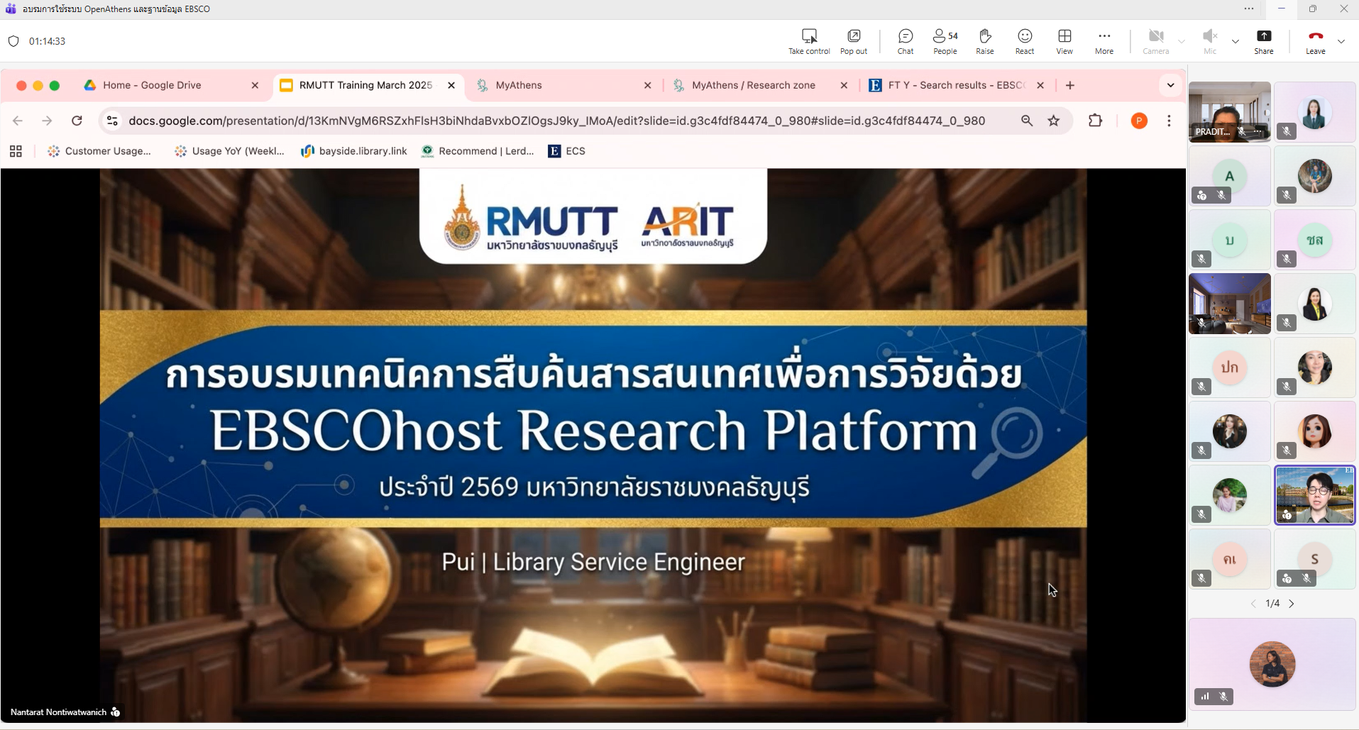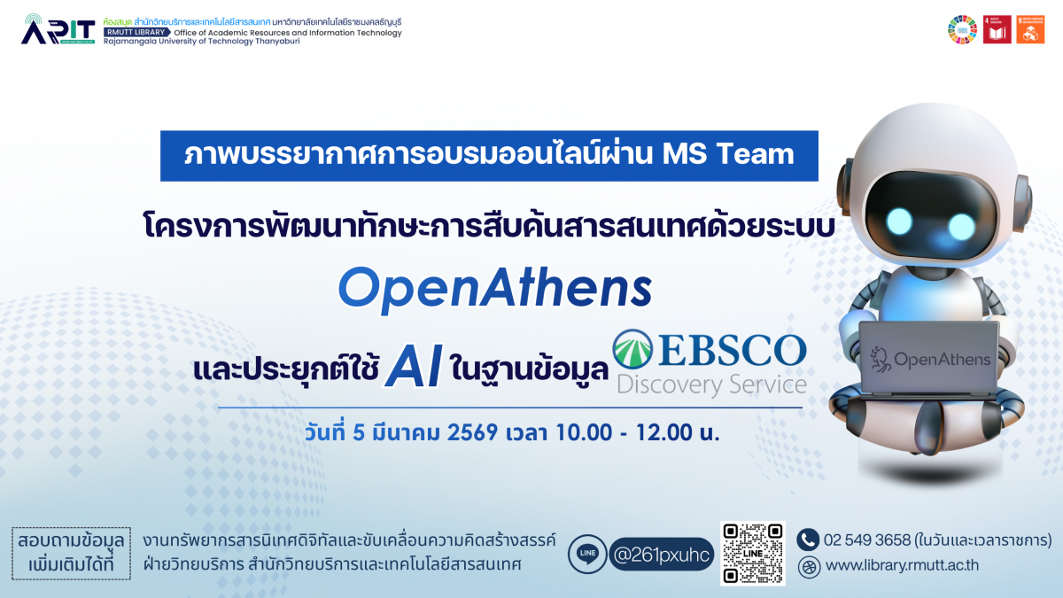 เมื่อวันที่ 5 มีนาคม 2569 เวลา 10.00 น. งานทรัพยากรสารนิเทศดิจิทัลและขับเคลื่อนความคิดสร้างสรรค์ ฝ่ายวิทยบริการ จัดอบรม "โครงการพัฒนาทักษะการสืบค้นสารสนเทศด้วยระบบ OpenAthens และประยุกต์ใช้ AI ในฐานข้อมูล EBSCO Discovery Service" ผ่าน Microsoft Teams นักศึกษาและบุคลากร มทร.ธัญบุรี เข้าร่วมอบรมและให้ความสนใจเรียนรู้การใช้งาน OpenAthens และการประยุกต์ AI ใน EBSCO Discovery Service เพื่อเพิ่มประสิทธิภาพการค้นคว้าและทำวิจัยในยุคดิจิทัล ยกระดับทักษะการสืบค้นสารสนเทศเชิงวิชาการให้แก่นักศึกษา อาจารย์ และบุคลากรของมหาวิทยาลัยในยุคดิจิทัล การอบรมครั้งนี้ได้รับเกียรติจาก คุณนันทรัตน์ นนทิวัฒน์วณิช ผู้เชี่ยวชาญจาก EBSCO Thailand มาบรรยายให้ความรู้เกี่ยวกับ