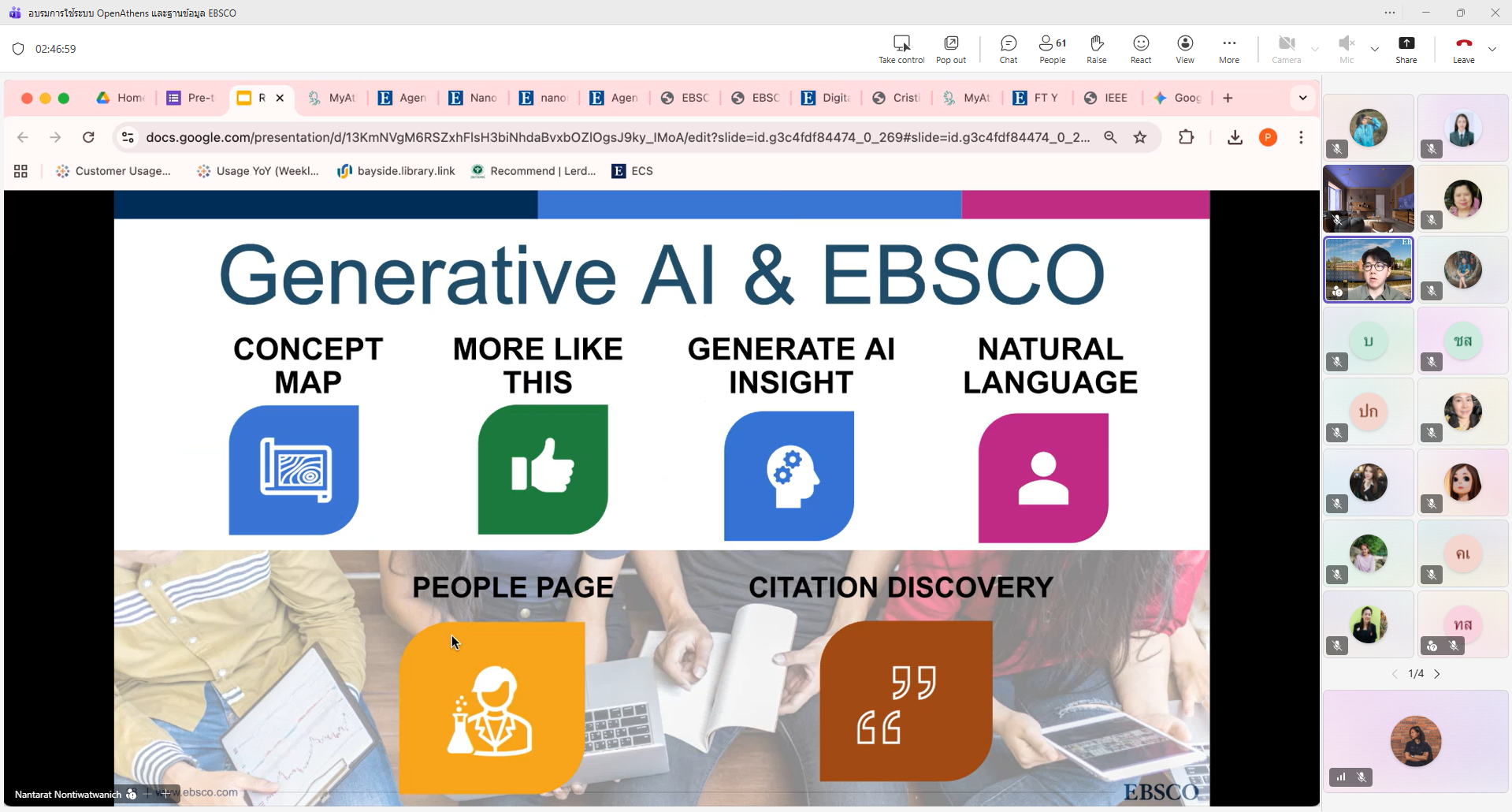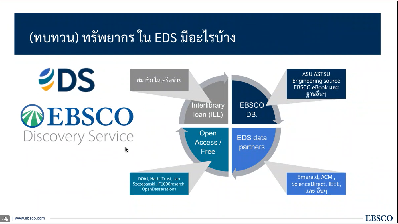 - การใช้ EBSCO Discovery Service (EDS) ตั้งแต่การสืบค้นพื้นฐาน การใช้ตัวกรอง การจัดการผลลัพธ์ ไปจนถึงการบันทึกข้อมูล