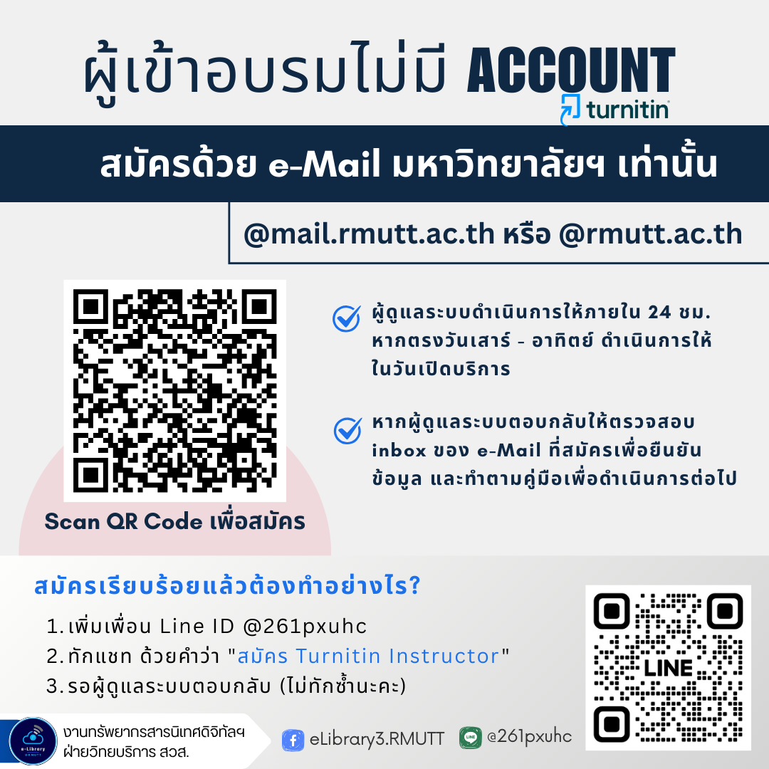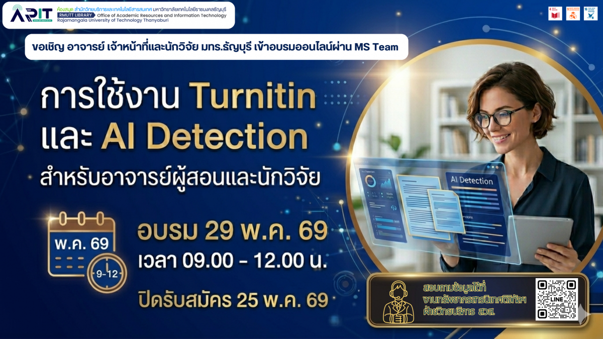งานทรัพยากรสารนิเทศดิจิทัลฯ ฝ่ายวิทยบริการ สำนักวิทยบริการและเทคโนโลยีสารสนเทศ ขอเชิญ อาจารย์ บุคลากร และนักวิจัย เข้าร่วมโครงการอบรมออนไลน์ เรื่อง “การใช้ Turnitin และ AI Detection สำหรับอาจารย์ผู้สอนและนักวิจัย” เพื่อเสริมสร้างความรู้ ความเข้าใจ และทักษะการใช้งานระบบ Turnitin อย่างมีประสิทธิภาพ รวมถึงการใช้ฟังก์ชัน AI Detection เพื่อสนับสนุนการจัดการเรียนการสอน การตรวจสอบผลงานวิชาการ และการวิจัยในยุคดิจิทัล